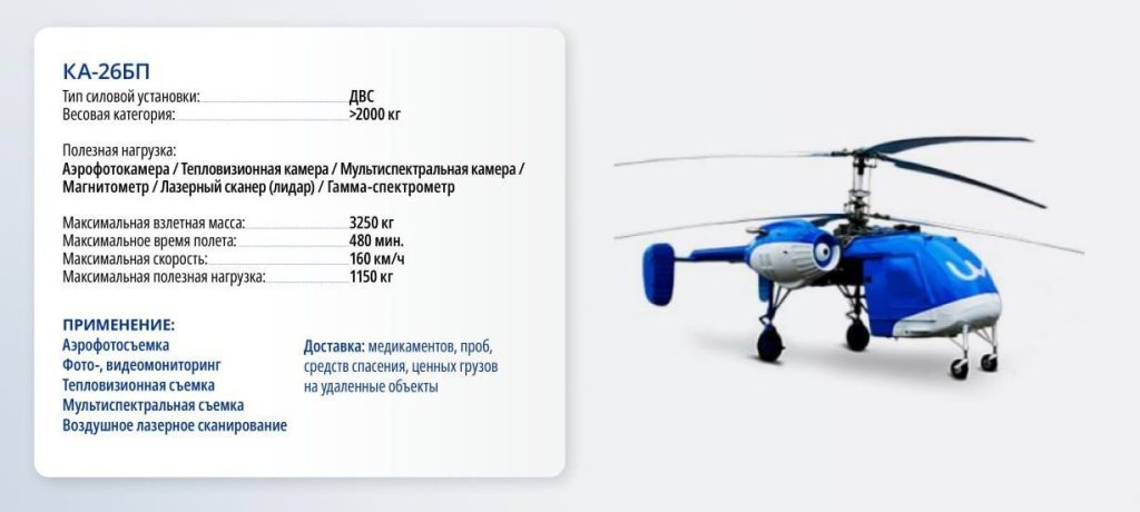Еще пару лет назад в каталоге Минпромторга публиковались характеристики БАС-3600, создающегося на базе Ка-226. Правда, тогда грузоподъемность обещали побольше — до 1000 кг. Дальность полета беспилотного вертолета с двигателем ВК-650 должна составлять 500 км, а время полета — 3,5 часа. До этого существовал и проект КА-26БП с более интересными ТТХ.