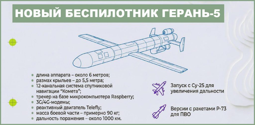 Новая «Герань-5» по своему облику и параметрам заметно отличается от других отечественных ударных БПЛА или ракет. Она не только расширяет номенклатуру ударных беспилотных систем, но и делает её более гибкой. За счёт комбинирования разных ударных средств и систем можно получать желаемые эффекты. Сам факт появления такого БПЛА имеет большое значение для развития и усиления ударных возможностей нашей армии. При этом новые беспилотники будут использоваться вместе с существующими и вносить вклад в достижение общих целей Спецоперации.