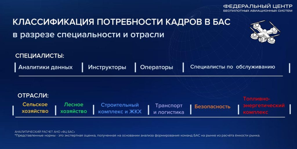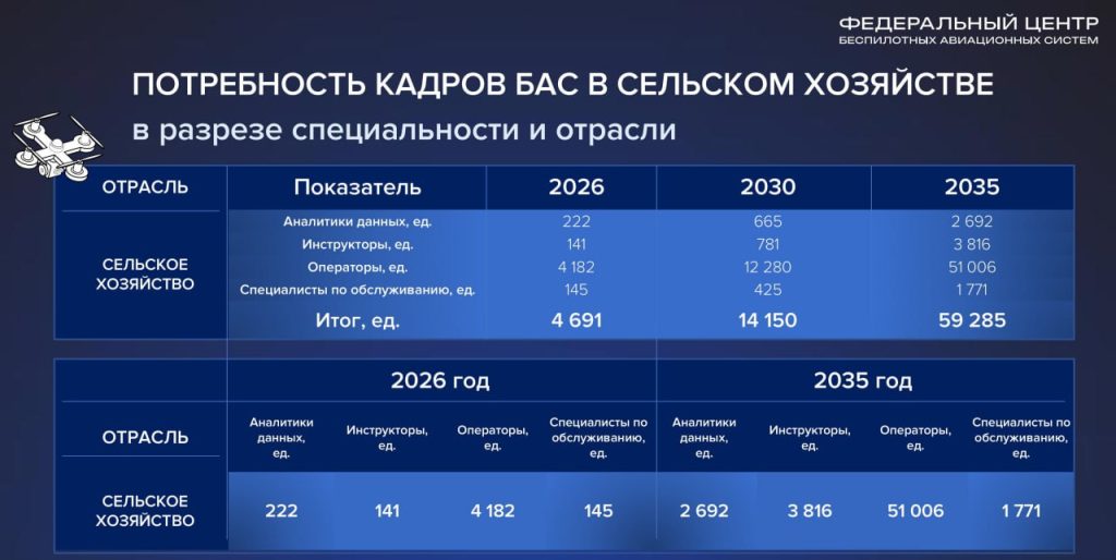 - в 2026 году отрасли нужны 222 аналитика данных, 141 инструктор, 4182 оператора БАС и 145 специалистов по обслуживанию. Всего примерно 4691 специалист;